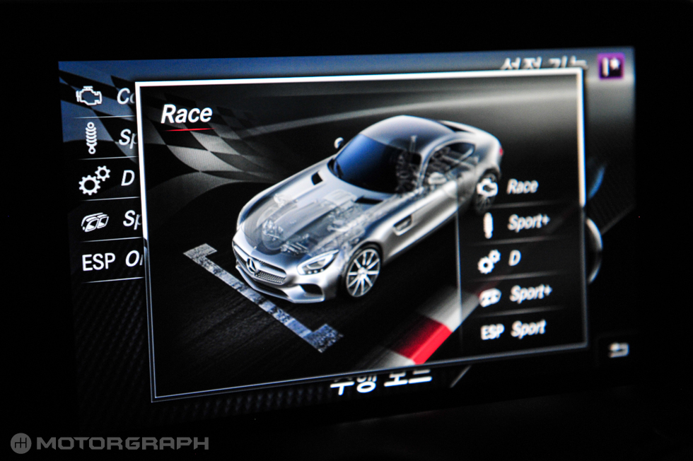 레이스 모드는 AMG GT를 극단적으로 만든다. 엔진과 변속기의 신경이 곤두서있다. 사람보다 똑똑하다. 각 기어의 한계속도에 도달해야 그제서야 변속을 하며, 또 스스로 기어를 낮출때도 엔진회전수가 가장 높은 시점을 계산한다. 직선주로에서 코너를 진입하기 위해 속도를 급격하게 줄이면, 마치 F1 레이스카처럼 빠르고 통쾌하게 기어를 연거푸 내린다.