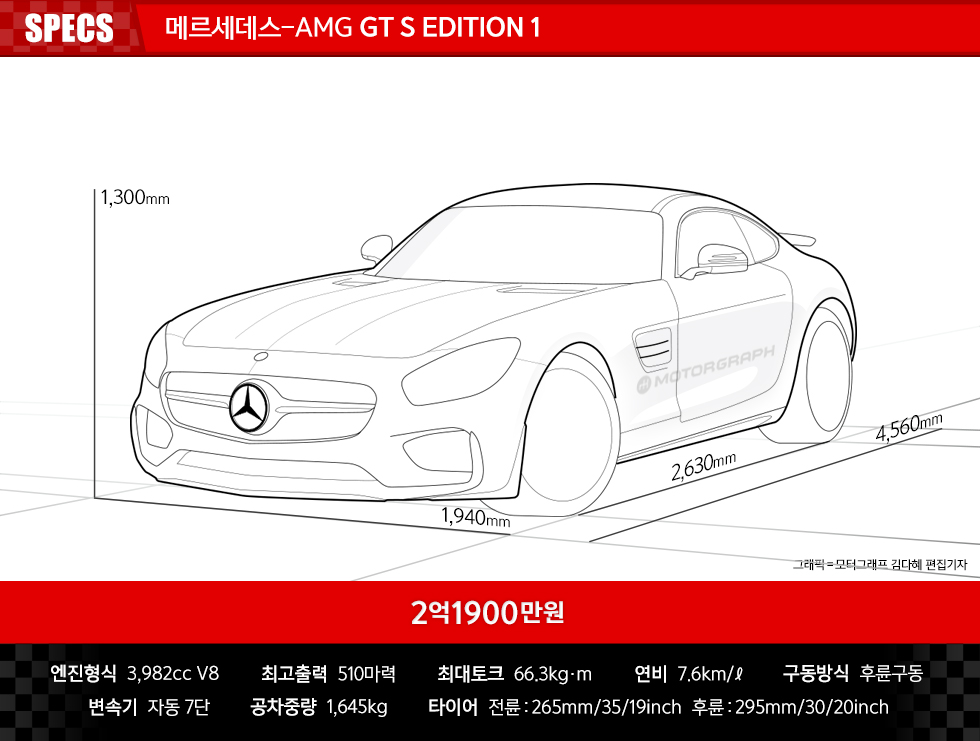 물론 타이어의 영향력도 크겠다. AMG GT의 앞바퀴에는 19인치 휠과 265/35 ZR19 타이어가 장착됐고 뒷바퀴에는 20인치 휠과 295/35 ZR20 타이어가 장착됐다. 타이어는 콘티넨탈 콘티스포츠콘택트 5P가 사용됐다. AMG에 주로 탑재되는 타이어다.
