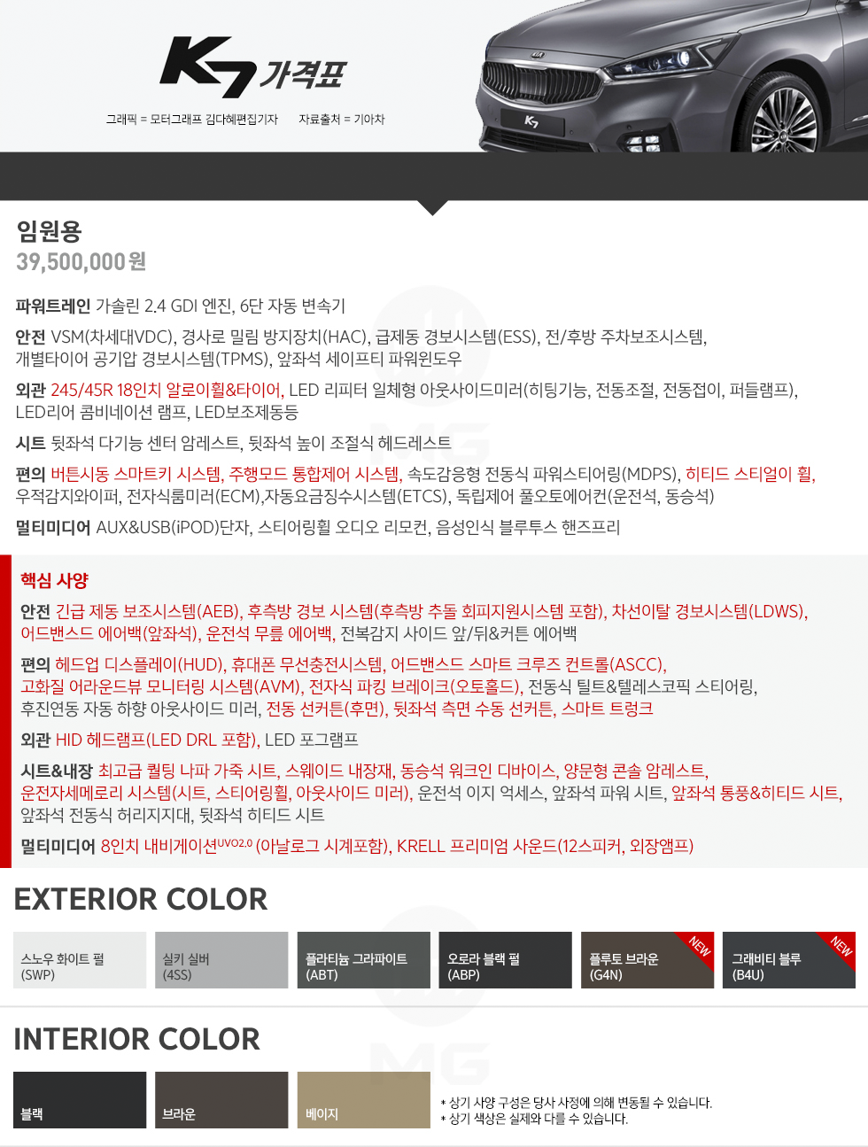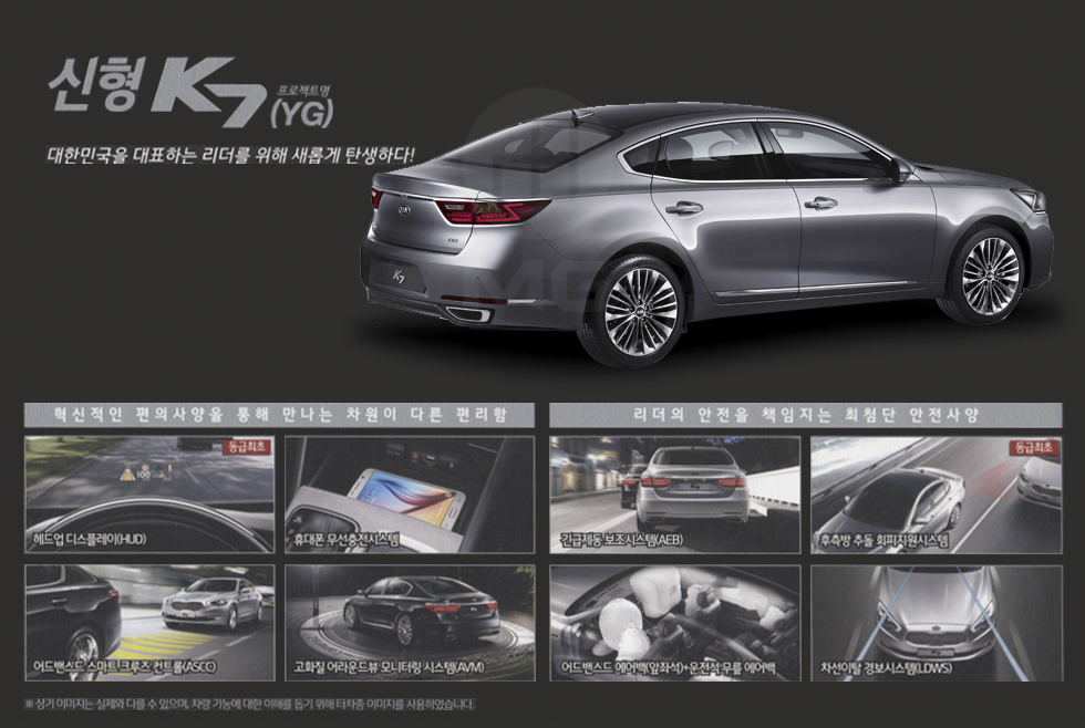 이에 따르면 신형 K7 임원용 모델은 2.4리터급 엔진이 장착됐으며, 가격은 3950만원이다. 삼성그룹 이 상무에게 제공하는 '2.4리터급 4000만원 이하' 차량 기준에 꼭 들어맞는다. 이는 현재 판매되고 있는 K7의 최상위 트림인 3.3 GDI(3902만원)보다 93만원이나 비싼 가격이다. 삼성그룹 규정 때문에 어쩔 수 없이 2.4 엔진을 장착했을뿐, 나머지 최고급 사양은 모조리 집어 넣은 것이다.