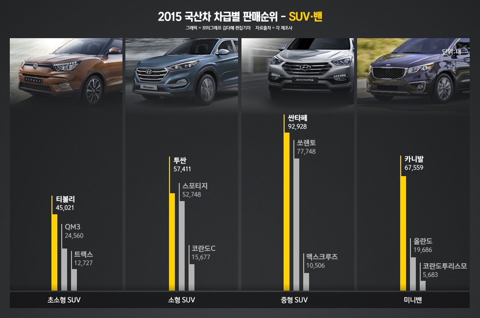 초소형 SUV 시장은 가장 늦게나온 티볼리가 트랙스 및 QM3를 제치고 1위를 차지했다. 소형 SUV는 투싼이 스포티지를 근소하게 앞섰지만, 최근 스포티지 판매량이 투싼을 2000~4000대가량 앞서고 있어 올해 순위는 바뀔 가능성이 높다. 중형 SUV급은 싼타페가 쏘렌토를 누르고 1위를 차지했다.