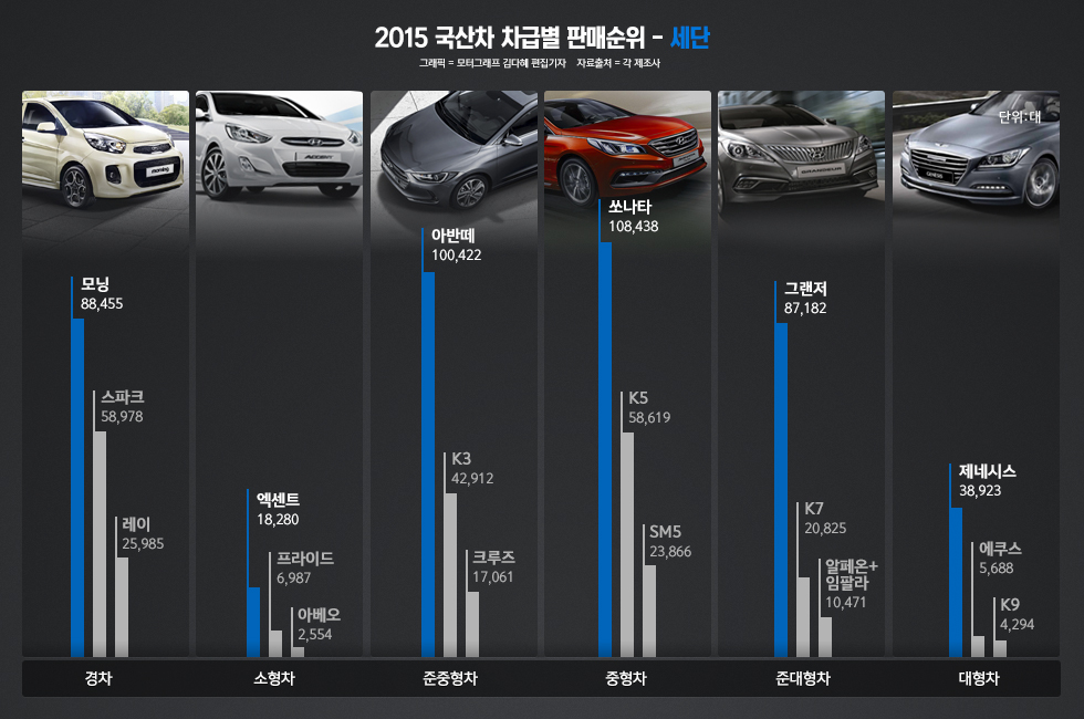 경차부터 미니밴까지 10개 차급별 판매량에서도 1위는 모두 현대기아차의 차지였다.