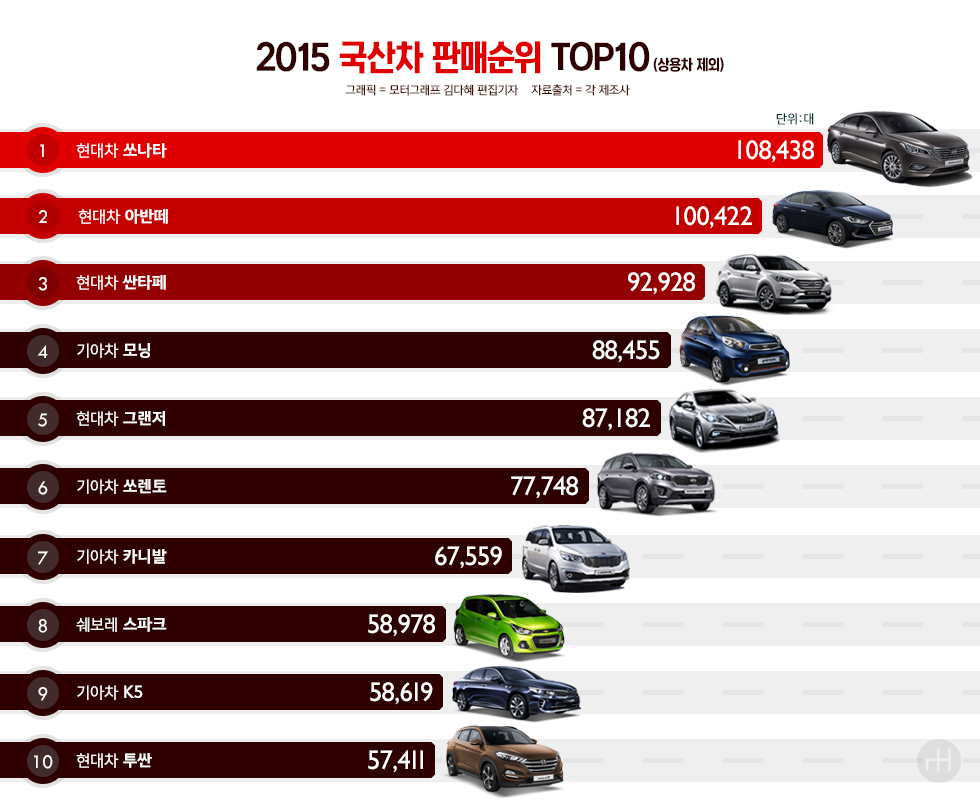 이밖에 기아차 카니발(6만7559대)와 쉐보레 스파크(5만8978대), 기아차 K5(5만8619대), 현대차 투싼(5만7411대)가 10위권에 이름을 올렸다.
