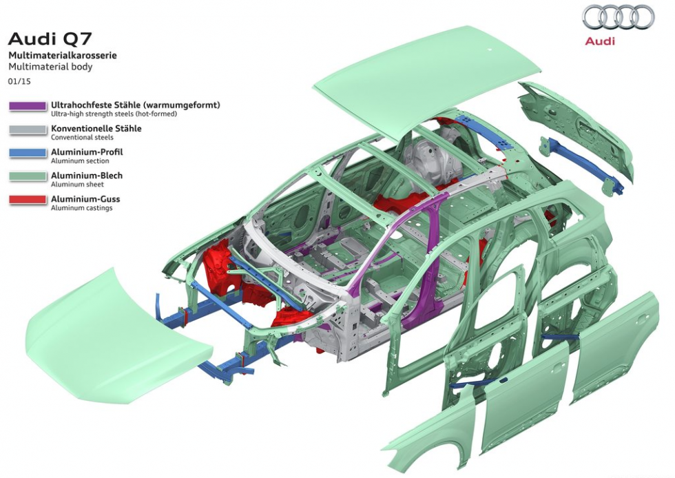 새로운 플랫폼을 통해 신형 Q7는 혁신적인 경량화에 성공했다. Q7 3.0 TDI의 경우 이전 세대 모델에 비해 325kg이 가벼운 1995kg에 불과하다. 세계적인 알루미늄 가공 및 공급 업체 노벨리스(NOVELIS)가 아우디의 경량화를 도왔다. 강성 및 안전을 위한 크로스 멤버는 미국의 두라(DURA)가 맡았다.