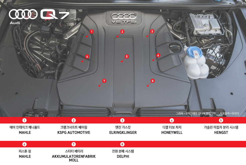 Q7에는 3.0리터 가솔린 및 디젤 엔진이 탑재되며 SUV 최초의 디젤 플러그인 하이브리드 모델도 출시될 예정이다. 3.0 TDI는 최고출력 272마력, 최대토크 61.2kg.m의 힘을 내는 버전과 최고출력 218마력, 최대토크 51kg.m의 버전으로 나뉜다. 고출력 모델은 정지 상태에서 시속 100km까지 6.3초만에 도달하며 유럽 기준은 연비는 17.5km/l에 달한다. 이 디젤 엔진의 터보 차저는 하니웰(HONEYWELL)이 공급한다.