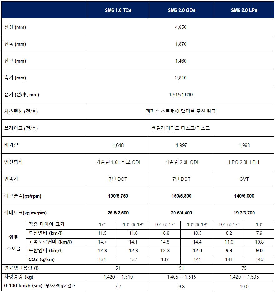 SM6는 르노삼성차의 6번째 모델로 우선 1.6 TCe와 2.0 GDe, 2.0 LPe 등 세 가지 모델이 출시되고, 향후 디젤 엔진이 탑재된 1.5 dCi 모델이 추가된다.