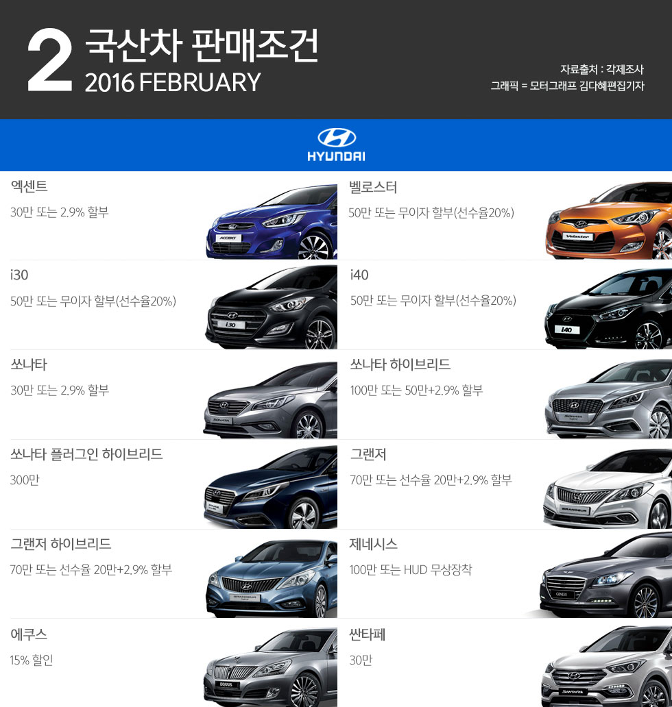 현대차는 2월 한 달간 엑센트, 쏘나타 구매 시 현금 30만원(또는 2.9% 할부)을 지원하며, 벨로스터, i30, i40 구매자에게는 50만원(또는 무이자 할부)을 할인해준다. 쏘나타 하이브리드 구매 시에는 현금 100만원(또는 50만원+2.9% 할부)을 지원하고, 쏘나타 플러그인 하이브리드 구매자에게는 300만원의 할인을 제공한다.
