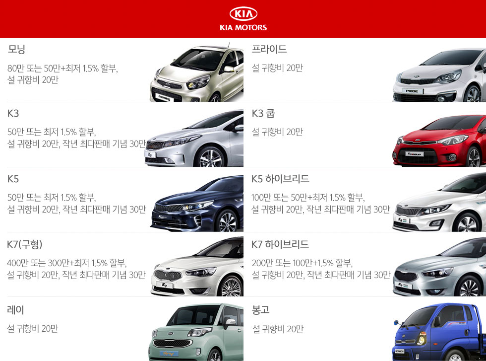 기아차는 이달, 일부 차종을 대상으로 설 귀향비 20만원을 지원한다고 밝혔다. 대상 모델은 모닝과 프라이드, K3, K3 쿱, K5, K5 하이브리드, 구형 K7, K7 하이브리드, 레이, 봉고3 트럭 등 10개 모델이다. 또, K3, K5, K5 하이브리드, 구형 K7, K7 하이브리드 등 5개 모델 구매 시에는 작년 브랜드 최다판매 실적을 기념해 30만원을 추가로 할인해준다고 설명했다. 단, 설 귀향비 지원은 19일 이전 차량 출고 시에만 적용된다.