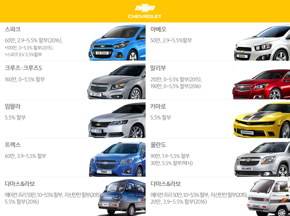 2015년형 말리부 가솔린과 LPGi 구매 시에는 210만원 할인과 무이자~5.5% 할부를 제공하며, 재구매 혜택 등을 통해 최대 320만원을 할인 받을 수 있다. 2016년형의 경우, 190만원의 할인을 비롯해 무이자~5.5% 할부를 지원한다. 또, 임팔라와 카마로 구매자에게는 5.5% 할부를 제공한다. 특히, 임팔라 구매 시에는 재구매 할인 혜택을 통해 최대 50만원을 할인받을 수 있다.