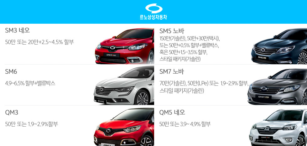 내달 출시를 앞두고 있는 중형세단 SM6 구매 시에는 4.9~6.5% 할부와 밸류박스를 제공한다. SM7 노바 구매자에게는 가솔린 모델의 경우 현금 구매 시 70만원(또는 1.9~2.9% 할부)을 할인해 주고, LPe 모델 현금 구매자에게는 50만원(또는 1.9~2.9% 할부)을 지원한다. 스타일 패키지 프리 기프트의 경우, 와인색 나파 가죽 시트, 앞좌석 통풍시트 등을 무상 장착해 준다.