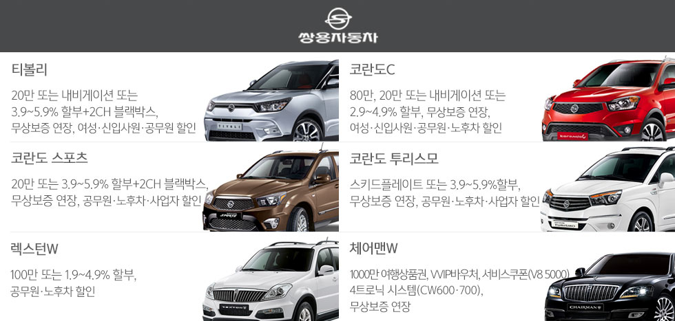 코란도 스포츠 구매 시에는 명절 귀성비 20만원(또는 2채널 블랙박스+3.9~5.9% 할부)을 할인해주고, 코란도 투리스모 구매자에게는 43만원 상당의 스키드플레이트(또는 3.9~5.9% 할부)를 무상 장착해 준다. 여기에 코란도 스포츠와 투리스모 구매자가 사업자일 경우엔 20만원을 추가로 지원한다. 렉스턴W 구매 시에는 100만원(또는 1.9~4.9% 할부)을 할인해준다.
