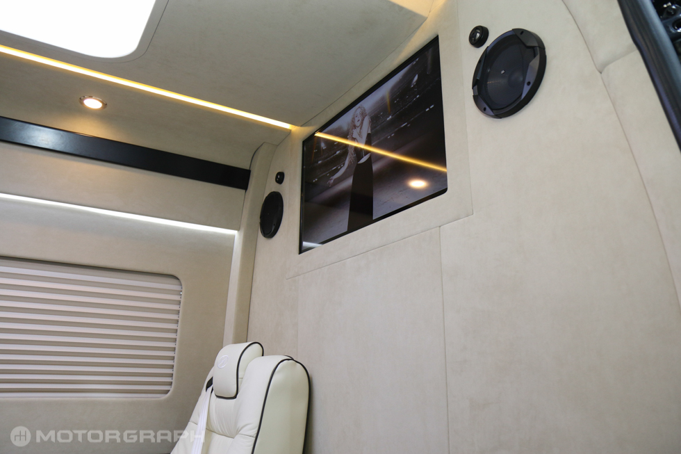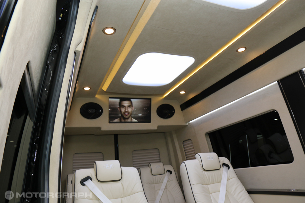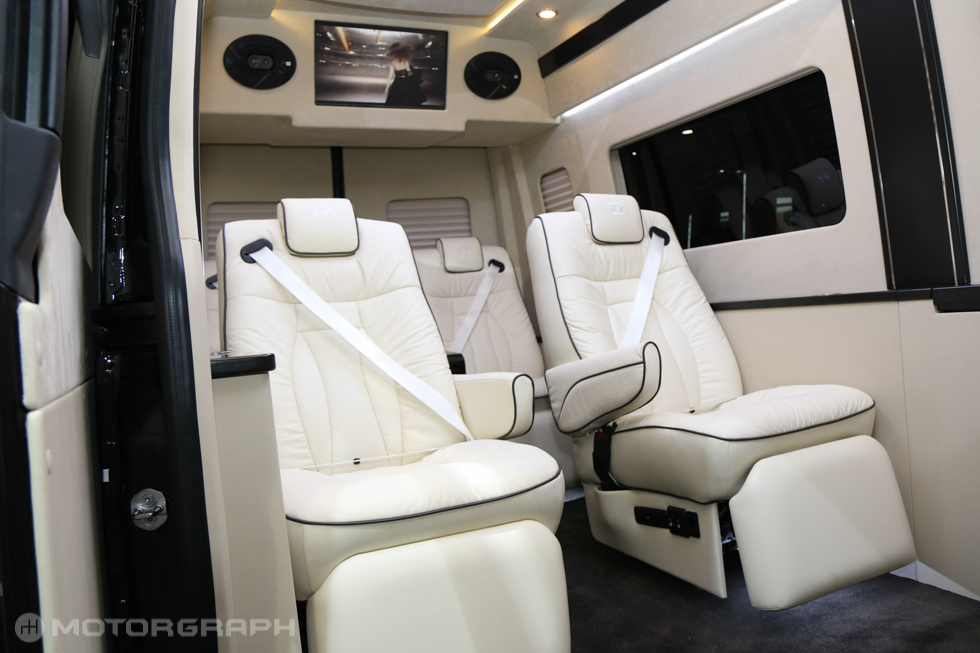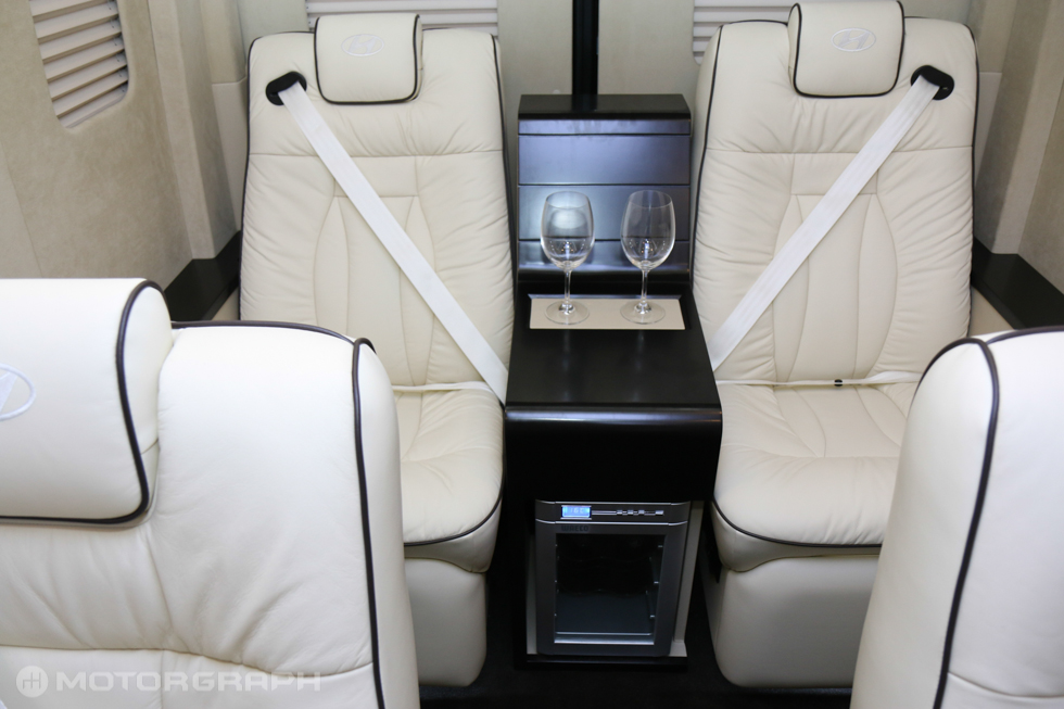 실내엔 모니터와 스피커 등이 앞부분 상단 중앙에 위치했으며, 좌석은 아이보리 색상의 쇼파형 시트가 1·2·2 배열로 구성됐다. 특히, 2열 좌석과 3열 좌석은 마주보는 방식으로 만들어져 비즈니스에도 활용할 수 있도록 만들어졌다. 여기에 바닥엔 카페트가 껄렸고, 냉장고와 인포테인먼트 시스템 컨트롤러 등 고급사양이 추가됐다.