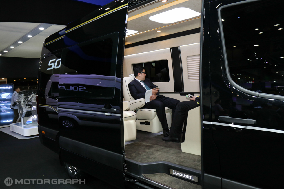 작년 모터쇼에서 공개된 리무진 모델은 버스 버전을 고급스럽게 개조한 모델로, 탑승 공간은 1열 운전석 및 조수석과 구분돼 막힌 구조로 만들어졌다. 또, 휠은 기본 버전과 달리 크롬 소재가 적용됐다.