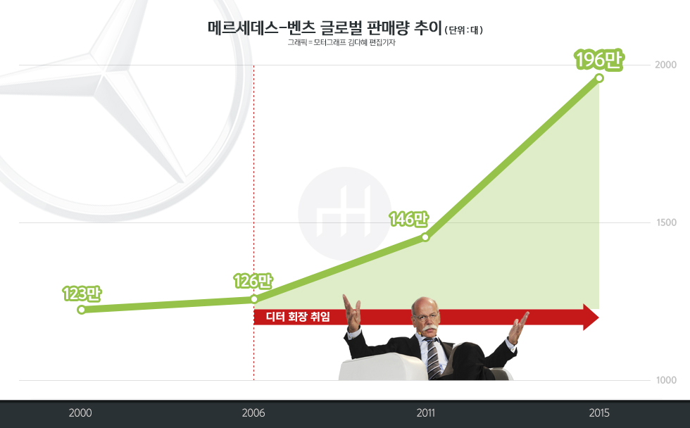 2006년 취임한 디터 제체 회장은 글로벌 경기 불황에도 불구하고 메르세데스-벤츠의 성장을 이끌었다. 제체 회장이 취임하기 전 메르세데스-벤츠의 글로벌 판매량은 120만여대 수준에 머물렀다. 하지만, 취임 이후 판매량은 성장을 거듭해 작년엔 196만대에 달하는 실적을 거뒀다. 제체 회장이 오면서 무려 161%의 높은 성장률을 기록한 것이다. 또, 브랜드 가치의 경우 2006년 21.8조에서 작년 26.7조로 약 22.5% 올랐다.