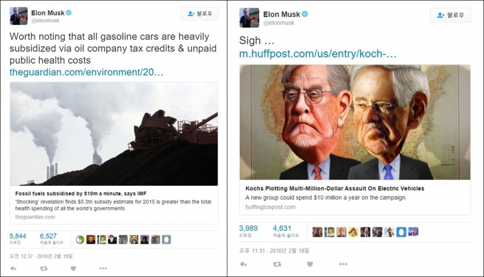 엘론 머스크는 지난 19일 자신의 트위터에 한 매체의 기사 링크를 걸면서 한숨짓는 듯한 표현의 짧은 글을 올렸다. 링크된 기사는 미국의 억만장자인 코크 형제(Koch Brothers)가 전기차 시장의 발전을 가로막는 로비를 시작했다는 내용을 담고 있다.