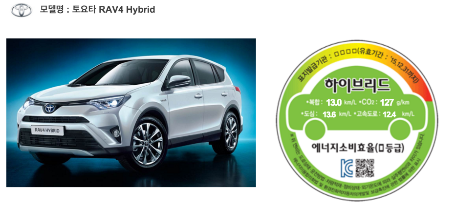 국내 표시 연비는 13km/l다. 도심 연비는 13.6km/l며 고속도로 연비는 12.4km/l다. 3등급 연비로 이산화탄소 배출량은 127g/km다. 라브4 하이브리드의 경쟁 모델이라고 할 수 있는 혼다 CR-V 가솔린 모델의 연비는 11.6km/l다.