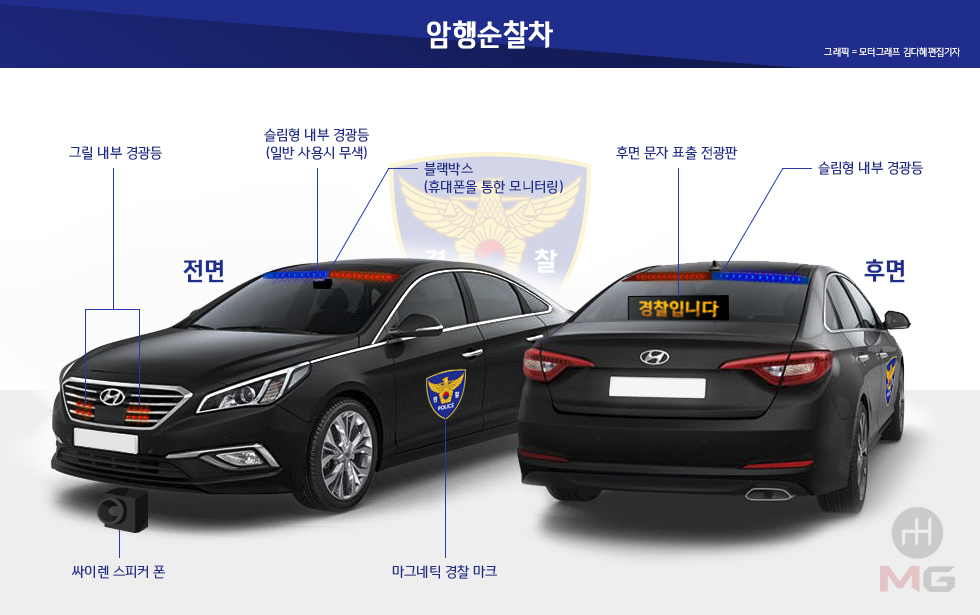 경찰은 25일, 현대차 쏘나타를 기반으로 개발한 암행순찰차를 공개하고 내달부터 경부고속도로에서 시범 운영에 들어간다고 밝혔다. 이 경찰차는 고속도로에서 난폭운전자나 얌체운전자 등을 단속하는 업무를 수행한다.