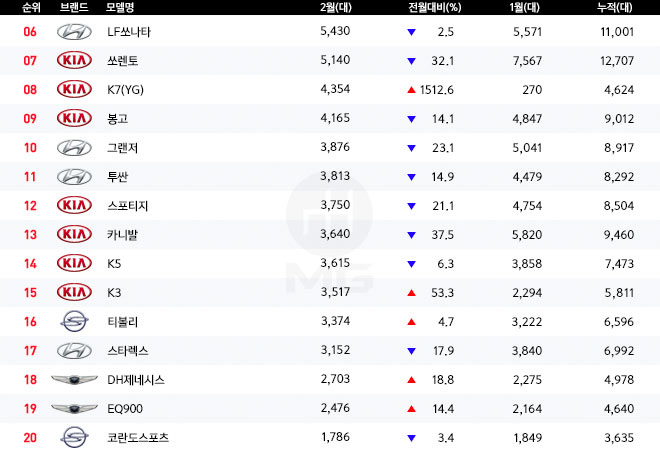 지난 2월은 가뜩이나 영업 일수가 적었고, 설 연휴까지 겹쳤다. 하지만 그럼에도 올해 1월에 비해 국산차 판매는 전반적으로 증가했다. 개소세 인하 혜택이 연장됐고, 올 1월 판매가 워낙 부진했던 탓도 있다. 그래서 대부분의 국산차 브랜드의 판매는 증가했지만, 유독 현대차와 기아차의 판매만 줄었다.