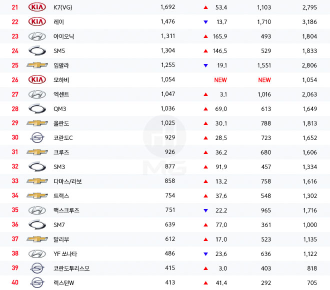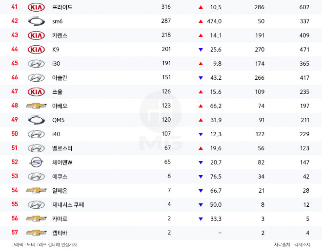 현대차와 기아차는 점유율이 조금 낮아졌지만 여전히 판매순위 상위권을 독식했다. 스파크와 쌍용차 티볼리만이 이를 견제할 뿐이다.