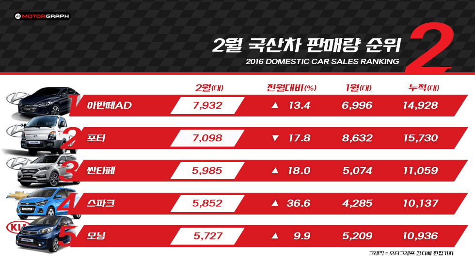 지난달 가장 많이 팔린 차는 현대차 아반떼로 7932대가 판매됐다. 지난 1월에 비해 판매는 13.4% 상승했다. 아반떼의 올해 누적판매대수는 1만4928대로 이 부분에서 2위를 달리고 있다.