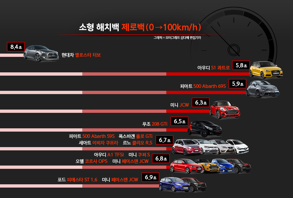 조사해 보니 아무리 작은 소형차라도 180마력 이상은 돼야 7초 안에 시속 100km에 도달할 수 있었습니다. 현대차 벨로스터 터보가 186마력(유럽 기준)으로 8.4초니, 이 차들이 얼마나 빠른지는 상대적으로 비교해 볼 수 있겠습니다.
