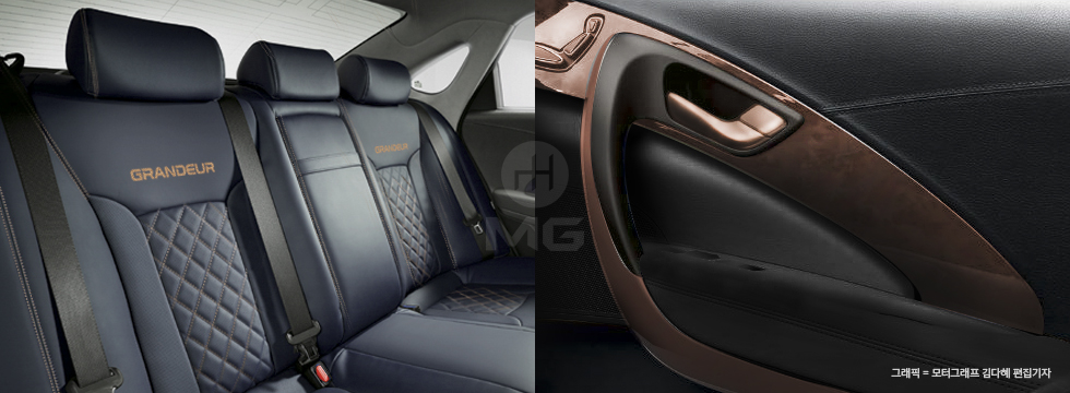 현대차 관계자에 따르면, 실내에는 블루 컬러와 브론즈 스티치가 조합된 시트가 탑재되며, 시트 허리 부분에 퀼팅 장식이 더해진다. 또, 기존에 없던 브론즈 색상이 적용된 트림 및 가니쉬가 장착돼 윗급 모델인 아슬란보다 고급스럽게 만들어진다.