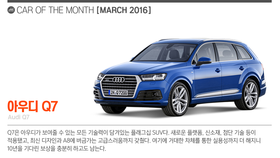 김상영 : 오래 걸렸다. 그만큼 심사숙고했단 뜻이다. 모든 것이 변했다. 새로운 뼈대와 구조 개선, 알루미늄을 적극 사용한 결과 무게는 최대 325kg이나 가벼워졌다. 이전 모델의 덩치가 너무 크기도 했지만, 이렇게 혹독한 다이어트는 쉬운 일이 아니다. 더욱이 가장 앞선 LED 기술과 TFT LCD 디스플레이, 카메라와 레이다를 통한 트래픽 잼 어시스트 등은 Q7을 가장 세련된 SUV로 만들기에 손색이 없다.