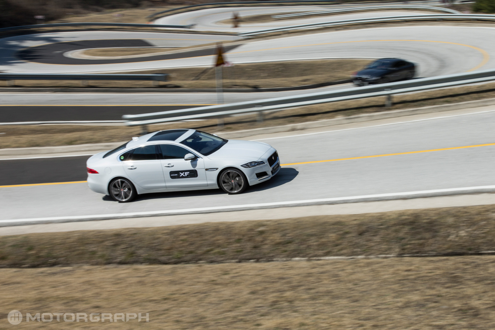 시각적인 불안감은 있었지만 고속으로 달리는 XF는 한없이 평온하기만 했다. 디젤 엔진은 속삭이듯 목소리 냈고, 서스펜션은 사뿐하게 그리고 단호하게 차체를 지탱했다. 순간적인 가속이 뛰어나진 않았지만, 회전은 부드러웠고, 힘은 꾸준했다. 평탄한 도로를 시속 80km로 달릴때 엔진회전수는 1700rpm에 머물렀다. 시속 100km에선 1900rpm, 시속 110km에선 2000rpm에 머물렀다. 에코 모드도 큰 변화는 없었다.