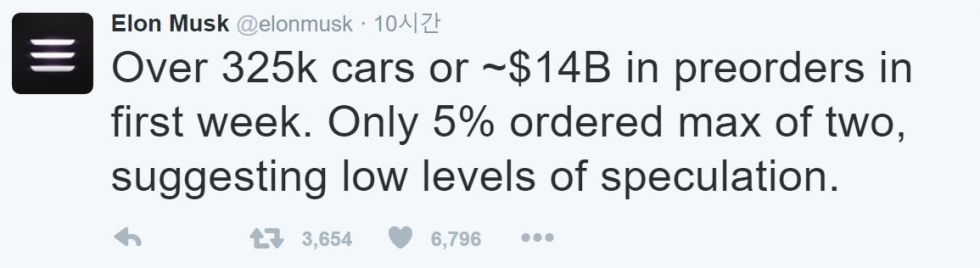 한껏 신난 앨론 머스크가 트위터에 글을 올렸다. 내년 말 출시되는 테슬라 모델3가 일주일만에 32만대 넘는 예약주문을 거두는 등 폭발적인 인기라서다. 머스크는 차량 가격으로 무려 16조원어치에 달한다는 설명도 덧붙였다.