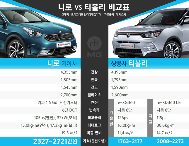 연비, 내외장 디자인과 품질, 기능, 아스팔트에서 도로 주행 능력을 보면 기아차 니로가 압도 해버려 싱거울 정도다. 다만 쌍용차 티볼리는 디젤엔진과 4륜구동을 옵션으로 갖추고 있다는 점에서 오프로드 주행에도 나름의 매력을 발휘한다. 차량 가격을 놓고 보면 니로가 훨씬 비싸게 보이지만 구입시 내야 할 세금이나 친환경 지원금 등을 감안하면 티볼리 디젤이 니로보다 오히려 좀 비싸다.
