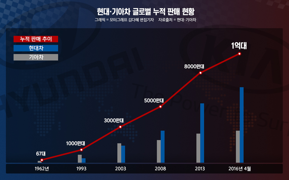 현대기아차가 이달 중 글로벌 누적판매 1억대 판매를 돌파한다. 이는 1962년 기아차가 자동차 판매를 시작한 이후 54년 만의 기록이다.