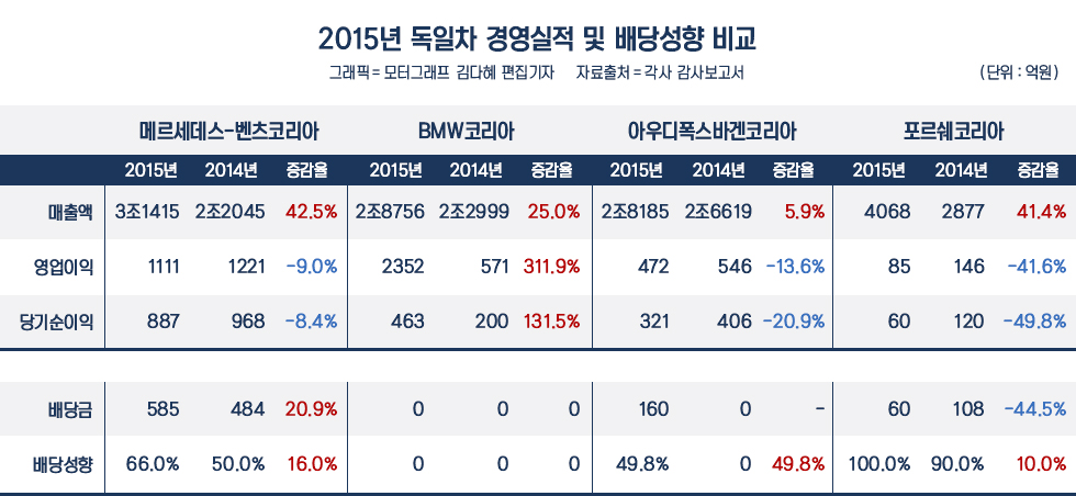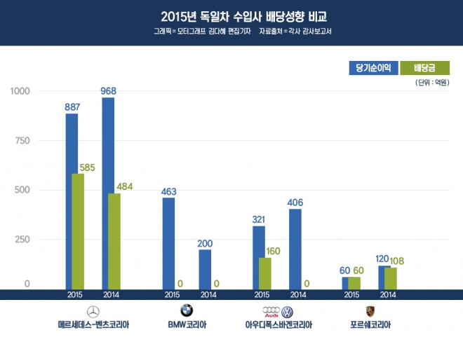 독일차 업체들의 배당성향을 두고 논란이 일고 있다. 메르세데스-벤츠코리아, 아우디폭스바겐코리아, 포르쉐코리아 등의 감사보고서를 살펴보면 작년 한 해 수익성이 악화 됐음에도 불구하고 본사와 주주에게 보내는 배당금을 확대했기 때문이다.