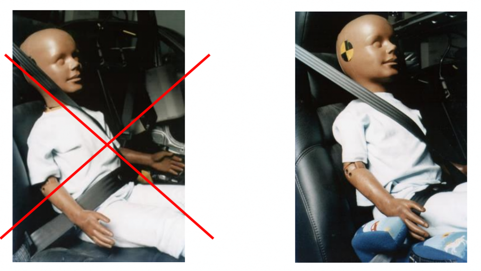 안전벨트는 성인을 기준으로 만들어졌기 때문에 아이들 체형에는 맞지 않는다. 올바른 벨트의 위치는 아이든 어른이든 골반과 어깨 위를 지나가게 착용하는 것인데, 아이들은 키가 작아 목을 가로지르게 지나 경우가 많다.