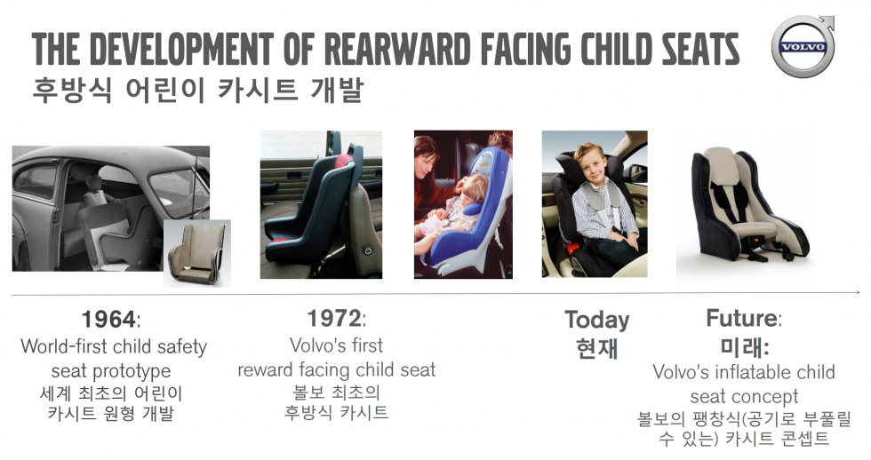 참고로 볼보는 1964년 우주선의 좌석에서 영감을 받아 후향식 카시트를 개발했고, 1972년 이를 상용화 시켰다. 이후 1999년에는 ISOFIX(이하 아이소픽스)에 장착하는 후향식 카시트도 만들었다.