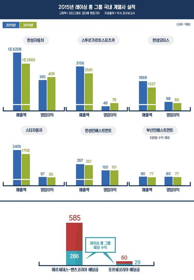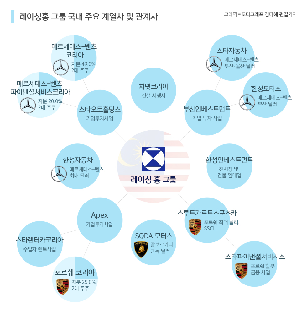 홍콩에 본사를 둔 레이싱홍 그룹은 한성자동차와 스투트가르트스포츠카(이하 SSCL), 스타자동차, 한성모터스, 한성인베스트먼트, 부산인베스트먼트, 스타오토홀딩스 등을 국내 계열사로 두고 있다. 뿐만 아니라 메르세데스-벤츠코리아(지분 49.0%)와 메르세데스-벤츠 파이낸셜서비스코리아(지분 20.0%), 포르쉐코리아(지분 25.0%) 등의 2대 주주다.