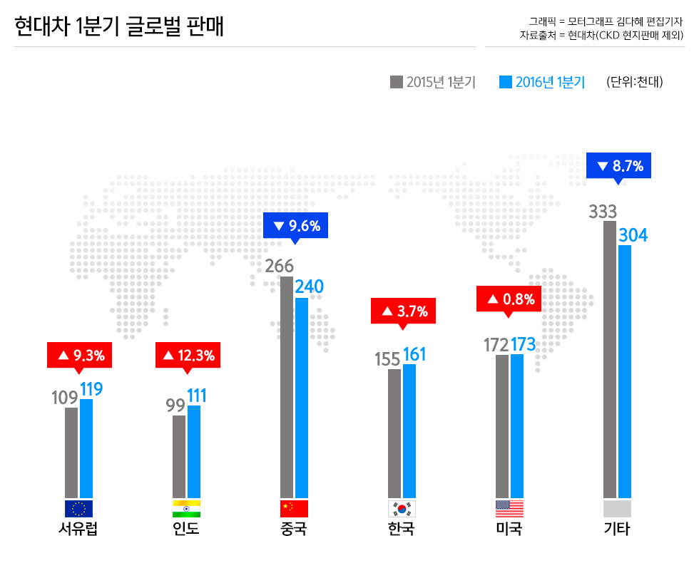 현대차 관계자는 “1분기 달러대비 원화 약세가 이어졌지만 신흥 시장의 경기침체 여파로 수출 물량이 감소했고, 신흥국 통화가치가 지속적으로 하락하며 원-달러 환율 효과가 희석됐다”고 밝혔다.