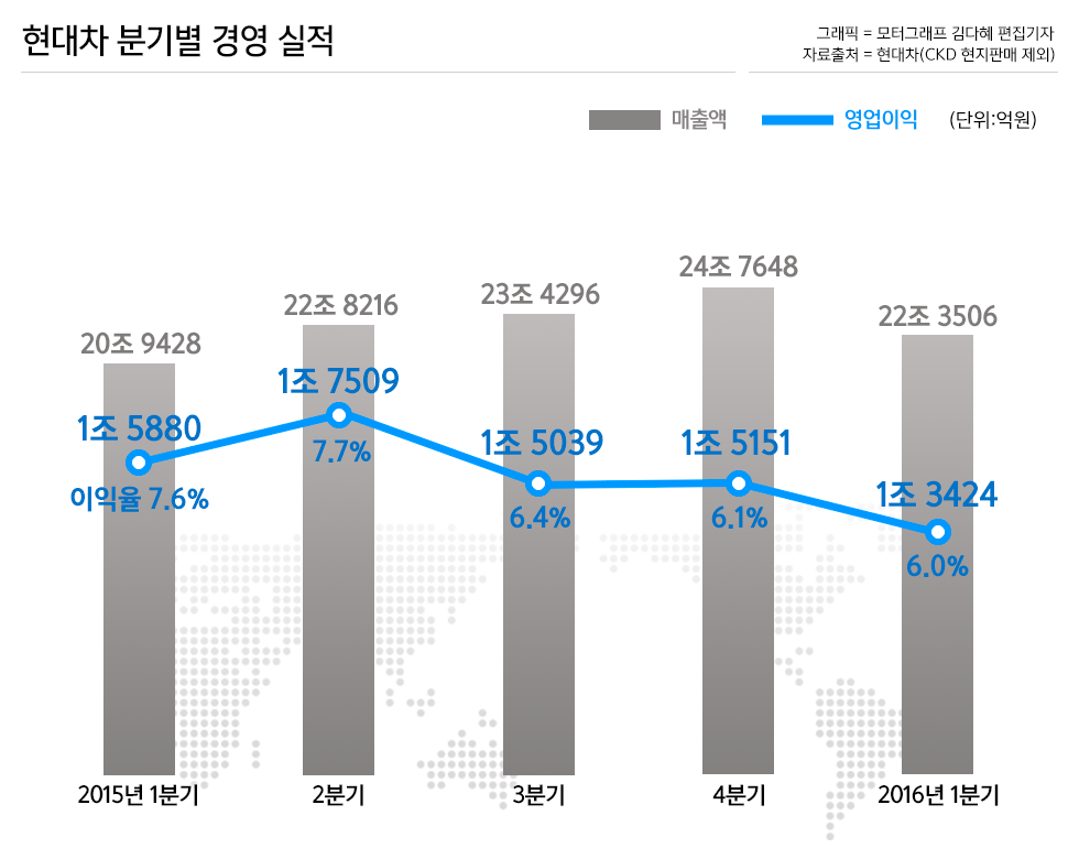 그럼에도 불구하고, 1분기 매출액은 지난해 같은 기간보다 6.7% 증가한 22조3506억원을 달성했다. 제네시스 EQ900과 SUV 제품군을 중심으로 판매 믹스가 개선됐고 금융 부문 매출액도 증가했다.