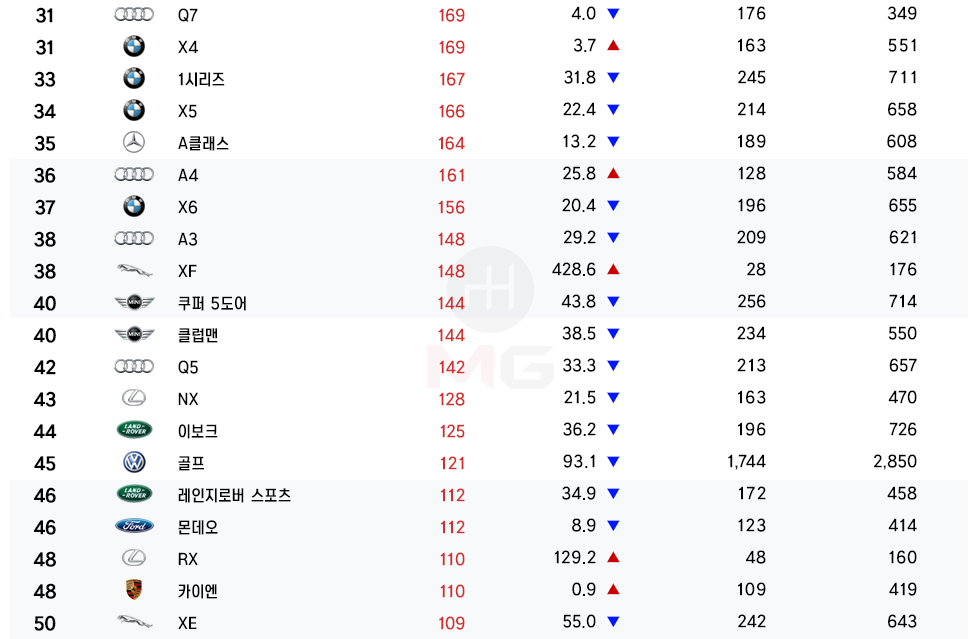 국가별로는 독일차가 1~5위를 차지했고, 50위권에는 총 29개 모델이 이름을 올렸다. 유럽차와 일본차는 각각 10대, 9대씩 포함됐고, 미국차는 2대에 불과했다.
