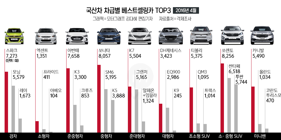 경차에서는 스파크가 7273대로 모닝(5579대)을 큰 차이로 앞섰다. 꾸준하던 레이는 1673대로 점점 줄어드는 추세다. 소형차 시장에서는 엑센트가 1351대 팔렸지만, 프라이드(411대)와 아베오(104대) 등은 존재감이 없다. 준중형 시장은 아반떼가 7658대 팔렸으나, 1만대를 훌쩍 넘기던 예년에 비해서는 저조하다. K3가 3300대로 선전했지만, 크루즈(853대)와 SM3(706대)는 더욱 줄었다. 아이오닉은 755대까지 떨어졌다.