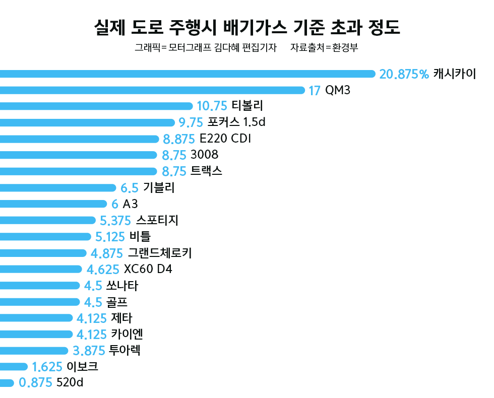한편, 이번에 조사 대상에 포함된 20개 차종 중 BMW 520d를 제외한 19개 차종이 인증기준 대비 질소산화물을 과다 배출하는 것으로 나타났다. 르노삼성 QM3는 17배로 캐시카이 다음으로 많은 질소산화물을 배출했고, 나머지 17개 차종도 약 6배를 더 배출하는 것으로 나타났다.