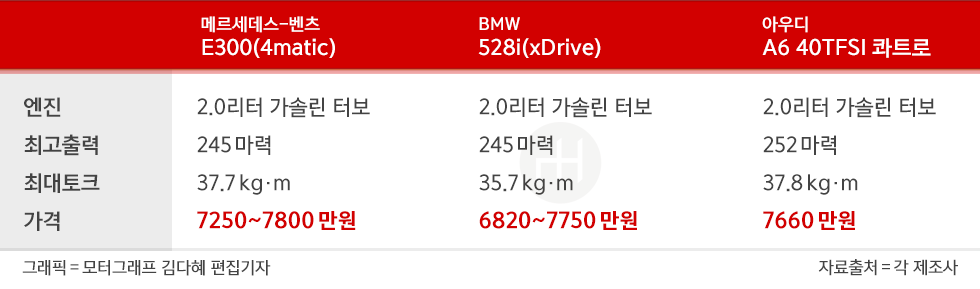 또, E300과 E300 4matic은2.0리터 가솔린 터보 엔진이 장착돼 최고출력 245마력, 최대토크 37.7kg.m의 힘을 낸다. 동급인 BMW 528i의 경우 최고출력 245마력, 최대토크 35.7kg.m를 발휘해 E클래스의 최대토크가 2kg.m높다. 반면 A6 40 TFSI 콰트로의 경우 최고출력 252마력, 최고출력37.8kg.m을 발휘해 E클래스에 보다 각각 7마력, 0.1kg.m 높다.