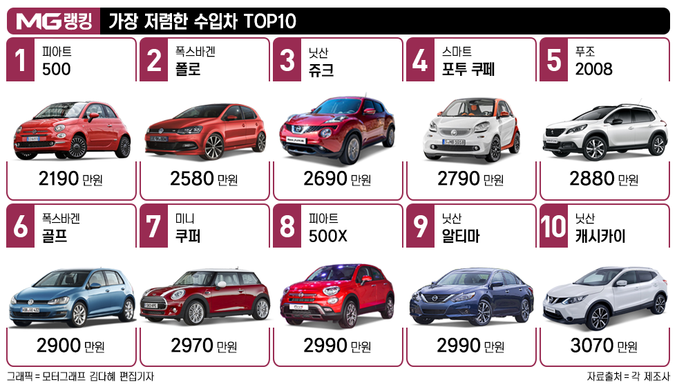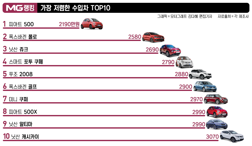 다음은 국내 판매중인 수입차 중 가장 저렴한 10종이다.