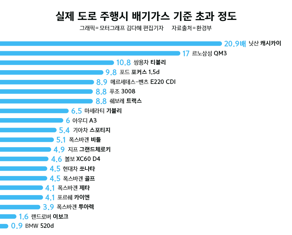 지난달 정부는 해당 차량을 조사한 결과 인증시험 과정에서 작동하던 ‘질소산화물 배출 저감장치’가 시험실에서는 잘 작동하지만, 실제 대부분 주행 상황에서는 작동하지 않았다고 발표했다. 이로 인해 시험실에선 규정을 만족시키지만 도로에선 인증 기준의 20.8배에 달하는 질소산화물이 배출된 것으로 나타났다는 설명이다.