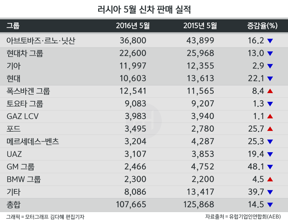 유럽기업인연합회(AEB)가 8일(현지시각) 발표한 자료에 따르면, 현대차그룹은 5월 한 달간 러시아 시장에서 총 2만2600대를 판매했다. 5월 신차 판매량은 지난해 같은 달과 비교해 13.0%가 감소했다.