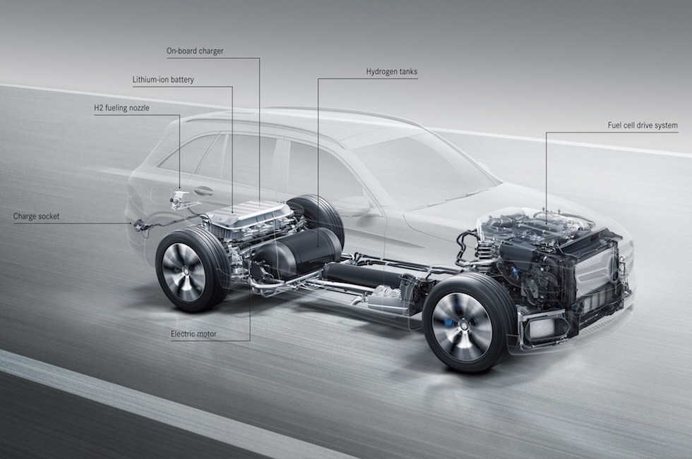 GLC F-CELL은 수소연료에만 의존하는 여느 수소연료전지차와 달리, 리튬 이온 배터리가 추가로 장착됐다. 이를 통해 수소연료가 없는 상황에서도 배터리가 전기모터에 동력을 전달하게 된다. 트렁크 밑바닥에 장착된 9kWh의 리튬 이온 배터리만으로 GLC F-CELL는 최대 50km까지 달릴 수 있다. 플러그인 시스템이기 때문에 외부 전원으로 배터리를 충전할 수 있다.
