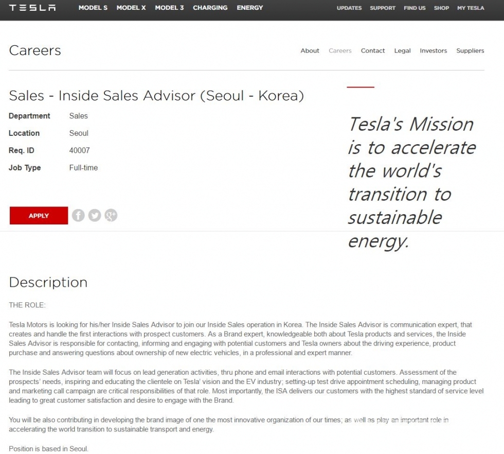 미국 전기차 업체 테슬라가 본격적으로 국내 판매망 구축에 나섰다. 먼저 세일즈 업무 위주의 인재 채용을 시작했다.