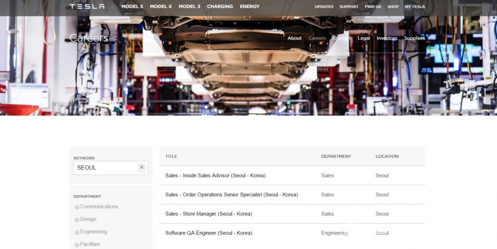 테슬라는 18일(현지시간), 홈페이지에 서울에서 일할 직원을 뽑는 채용 공고를 올렸다. 채용은 세일즈 어드바이저(Sales Advisor)를 비롯해 주문 전문가(Order Operations Senior Specialist), 매장 매니저(Store Manager), 소프트웨어 품질보증 엔지니어(Software QA Engineer) 등 4개 부문으로 진행 중이다.