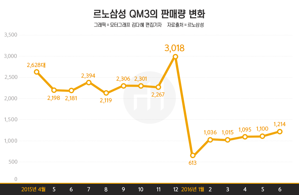 하지만, QM3 판매량은 올해 1월 613대로 폭락한 후 좀처럼 회복하지 못하고 있다. 당시만 해도 전월에 3018대나 판매하는 바람에 잠시 주춤한 것으로 생각됐지만, 아직까지 1000대 초반 수준을 벗어나지 못하는 모습이다.