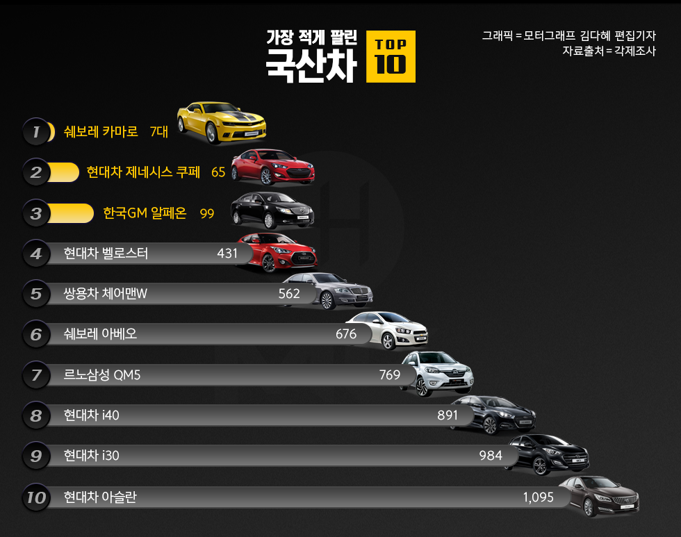 올해 1월부터 6월까지 국내에서는 총 81만2265대의 국산차가 판매됐다. 가장 많이 판매된 차는 현대차 포터로 5만4689대가 판매됐다. 그리고 가장 적게 판매된 차는 쉐보레 카마로로 상반기 동안 단 7대만 판매됐다. 카마로는 한국GM이 수입해 판매하지만, 한국GM의 여러 국내 인프라를 사용하기 때문에 국산차로 분류했다.