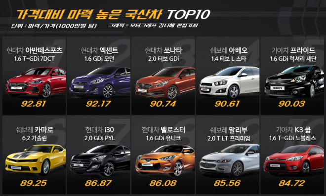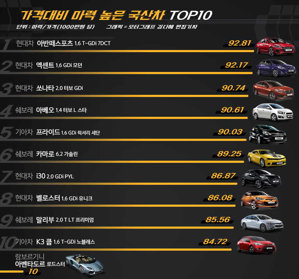 모터그래프에서 '서민들의 포르쉐'라고 할만한 '가격 대비 마력 높은 국산차 TOP10'을 조사했다(자동변속기 기준). 다만, 이번 조사는 제원 수치만 단순 비교한 것으로, 반드시 마력이 높다고 빠른 차라고 단정 지을 수 있는 것은 아니다. 어디까지나 흥미를 위한 집계다.