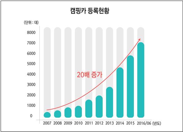 특히, 레저 및 캠핑인구가 늘면서 캠핑카 등록대수의 증가세가 두드러졌다. 캠핑카 등록대수는 지난 2007년 346대였으나 지난달 기준 6768대로 10년 동안 약 20배 증가한 것으로 집계됐다. 문화체육관광부에 따르면 현재 전국에 약 1200개의 캠핑장이 운영되고 있고, 캠핑인구는 약 500만명인 것으로 추산된다.